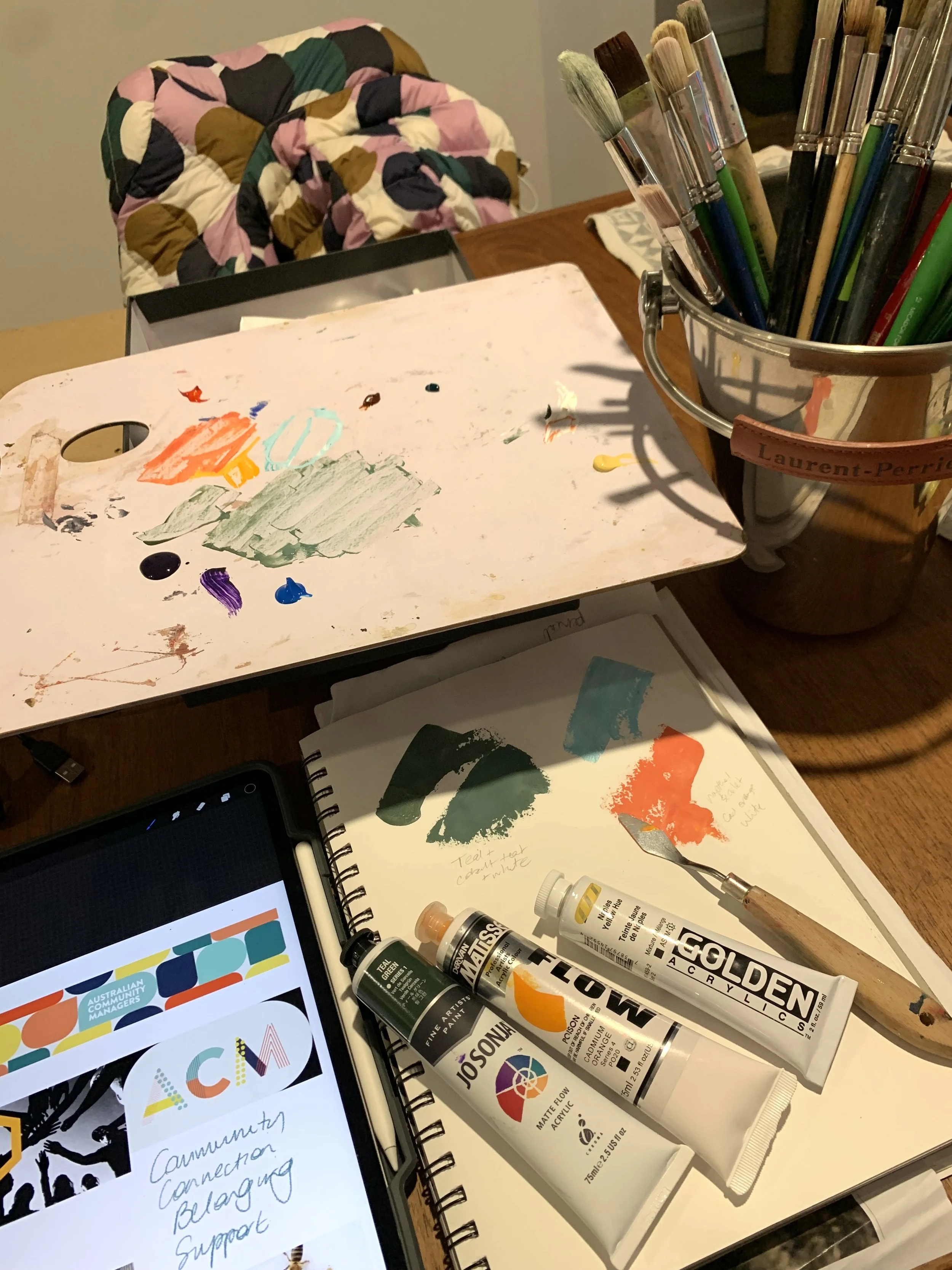 Referencing the brand colours, iconography, and mission of the membership, I first played around with the palette and ideas in a digital format, before committing to canvas. Ness was taken by all three suggestions, so we went ahead with a tripitych.
